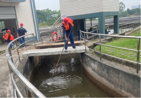 值班人員對(duì)調(diào)節(jié)池內(nèi)死魚(yú)進(jìn)行打撈