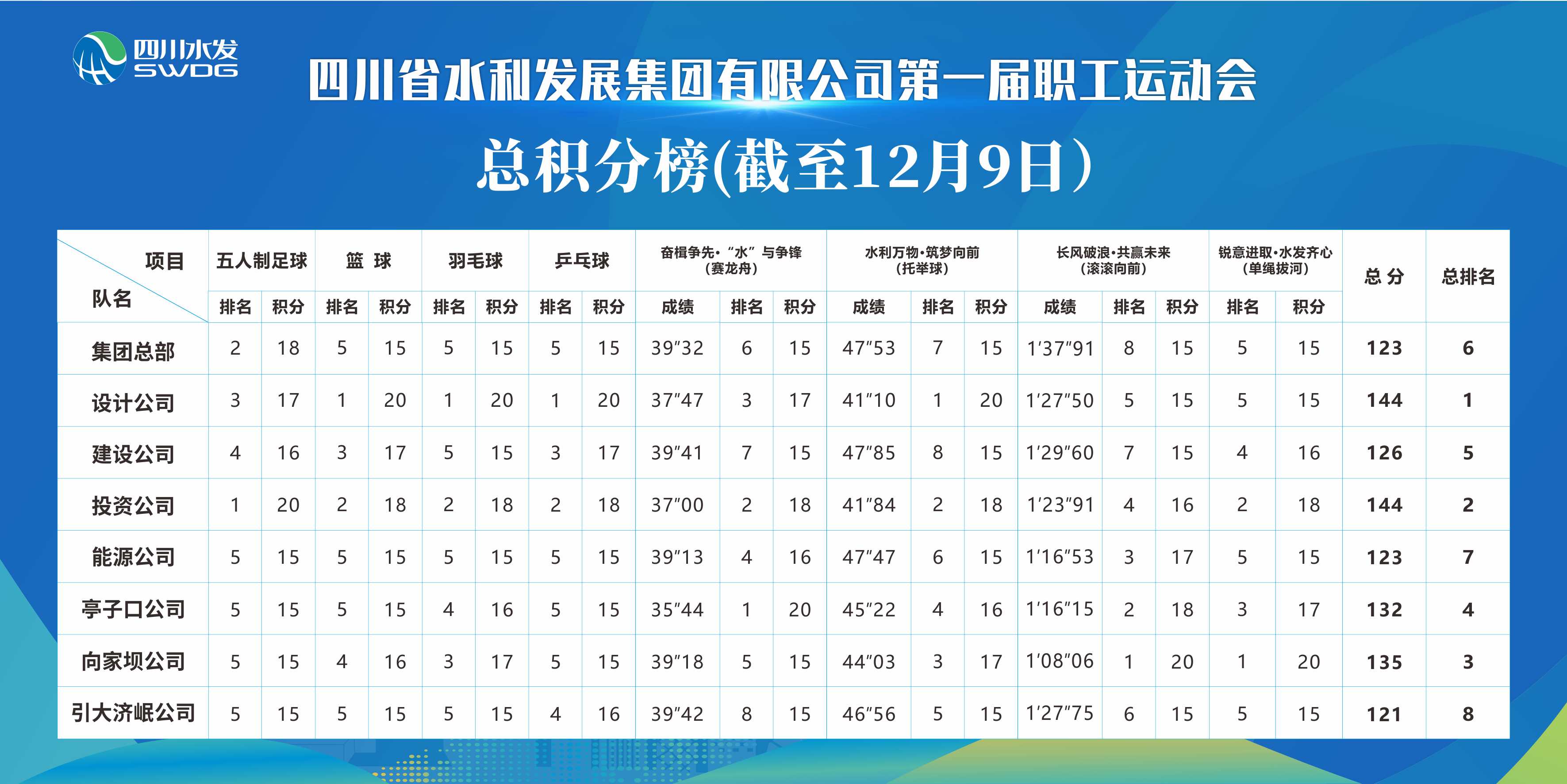 本屆職工運動會是水發集團成立以來舉辦的第一次大型體育活動,12月5日-8日,已進行了籃球、五人制足球、乒乓球、羽毛球,共60場循環賽和排位賽。這既是全體水發人的盛大節日,也是檢驗集團企業文化建設成果的一次盛典,更是展示水發人良好精神風貌的一個契機。水發集團現已構建成了投建運管一體化組織體系,并實現高效運行。時到歲末年終,在工作最忙碌的階段,希望通過本次運動會進一步激發干部職工干事創業的精氣神,提升攻堅克難的戰斗力,為圓滿實現集團年度各項目標任務拼搏實干貢獻力量。